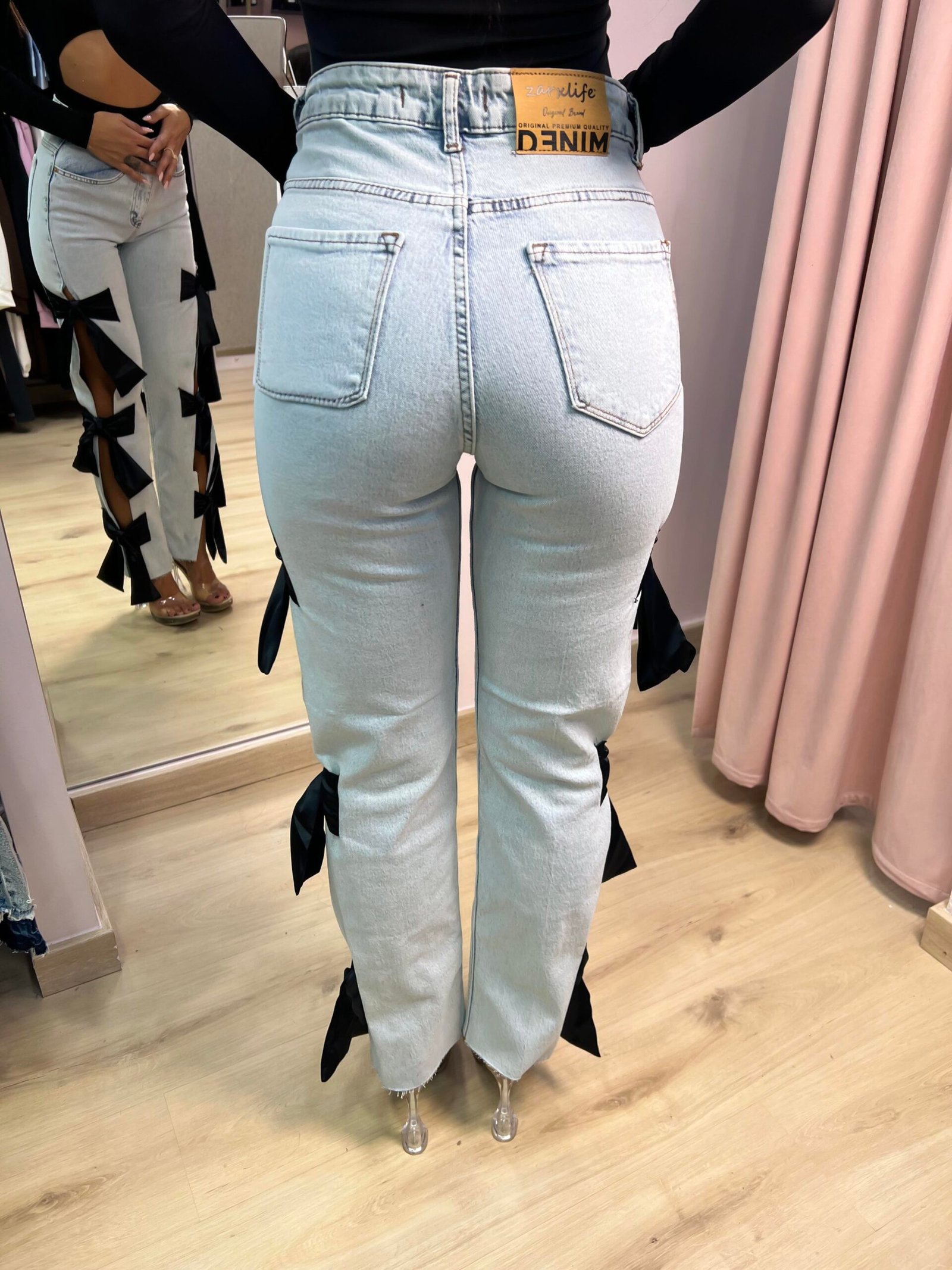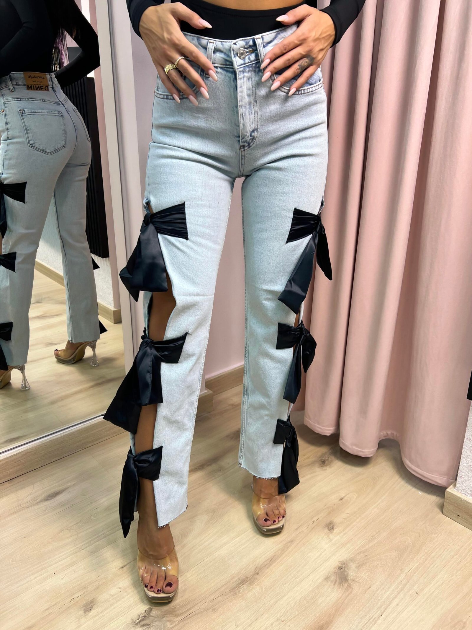 Ένα jean που ξεχωρίζει για τον παιχνιδιάρικο και θηλυκό χαρακτήρα του. Το κλασικό denim αποκτά statement εμφάνιση με τα κοψίματα κατά μήκος των ποδιών, διακοσμημένα με εντυπωσιακούς σατέν φιόγκους. Ιδανικό για fashion-forward εμφανίσεις που θέλουν να τραβήξουν όλα τα βλέμματα.