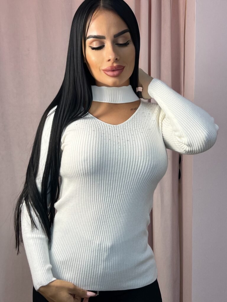 Εφαρμοστή πλεκτή μπλούζα με μακρύ μανίκι και ιδιαίτερη λεπτομέρεια στο ντεκολτέ με τρουκς. Μοντέρνο σχέδιο που συνδυάζει άνεση με κομψότητα, ιδανικό για casual αλλά και πιο βραδινές εμφανίσεις.