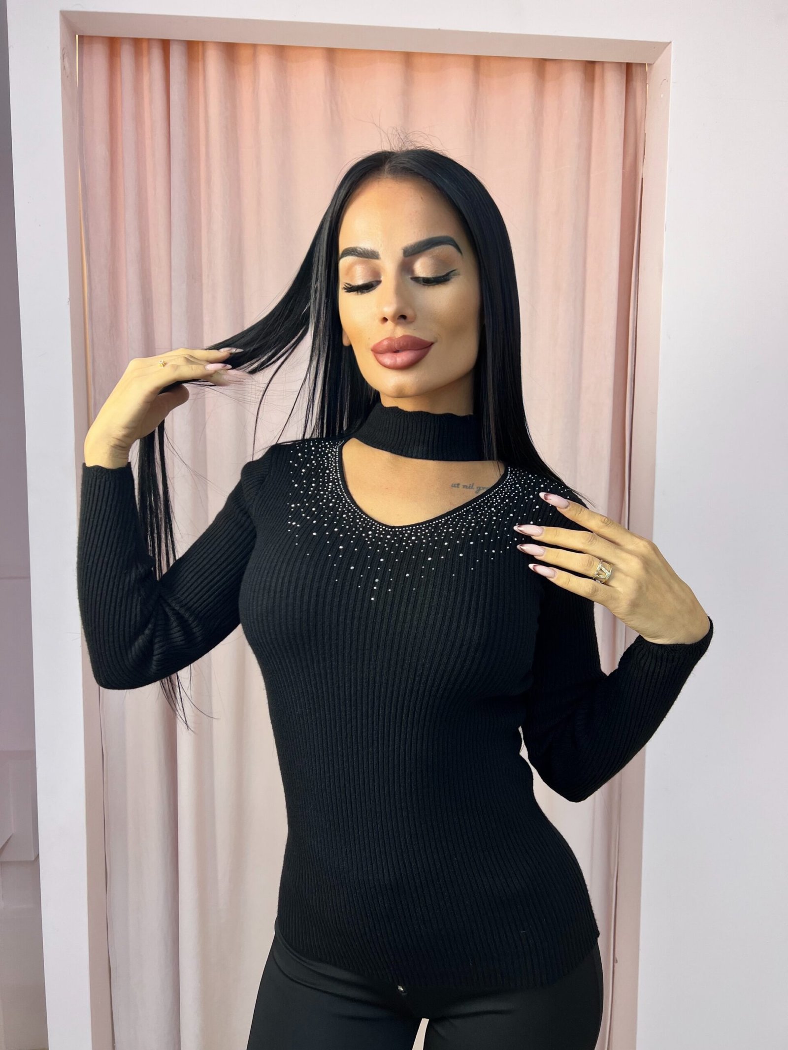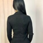 Εφαρμοστή πλεκτή μπλούζα με μακρύ μανίκι και ιδιαίτερη λεπτομέρεια στο ντεκολτέ με τρουκς. Μοντέρνο σχέδιο που συνδυάζει άνεση με κομψότητα, ιδανικό για casual αλλά και πιο βραδινές εμφανίσεις.