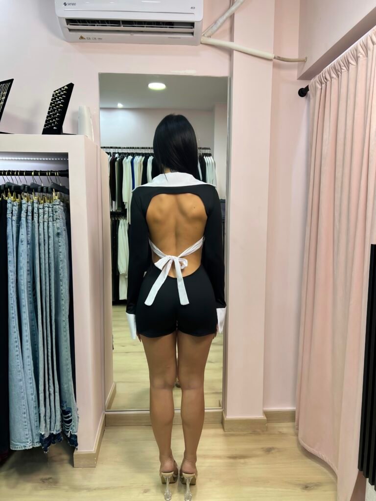 Ένα ιδιαίτερο κομμάτι που συνδυάζει θηλυκότητα με τολμηρό design. Το ολόσωμο σορτς διαθέτει μακρύ μανίκι, κοντό γιακά και εντυπωσιακό κόψιμο στο ντεκολτέ που αναδεικνύει τη θηλυκότητα. Στο πίσω μέρος ξεχωρίζει η ανοιχτή πλάτη με δέσιμο φιόγκο, δημιουργώντας μια κομψή αλλά και sexy εμφάνιση.