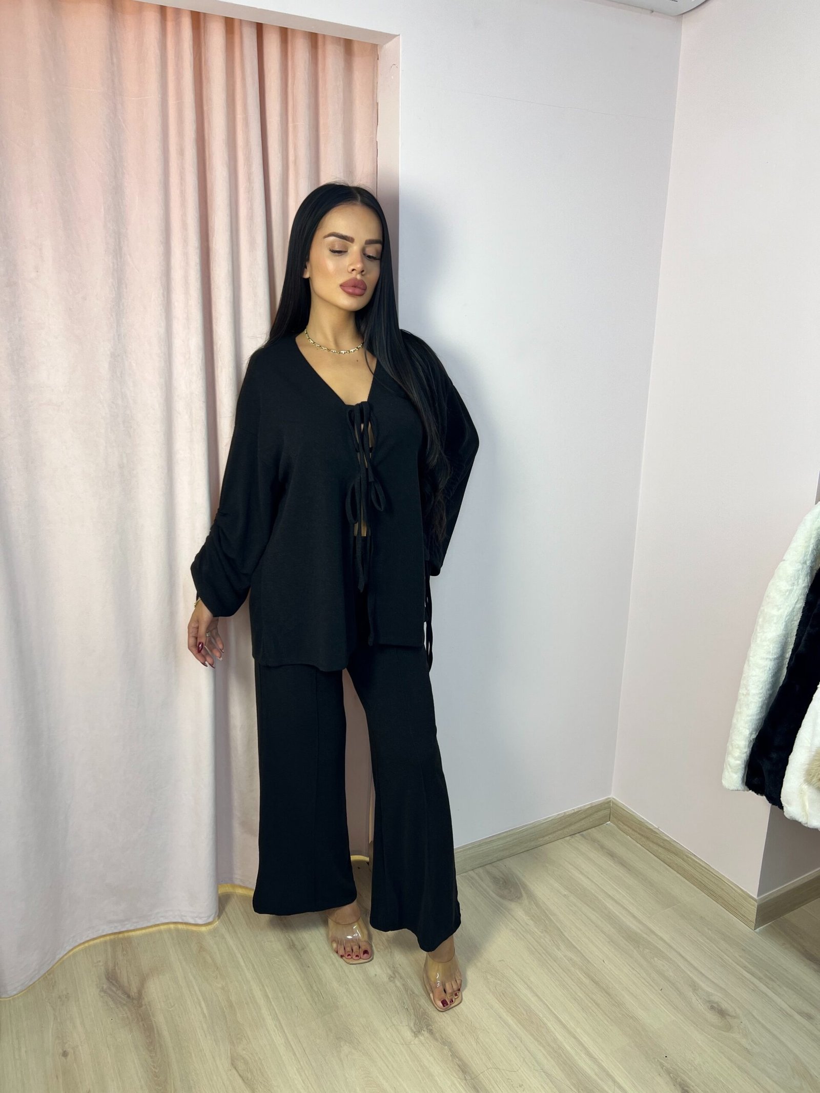 Σετ Παντελόνι με Ριχτή ζακέτα και δέσιμο στα μανίκια — ΜΑΥΡΟ