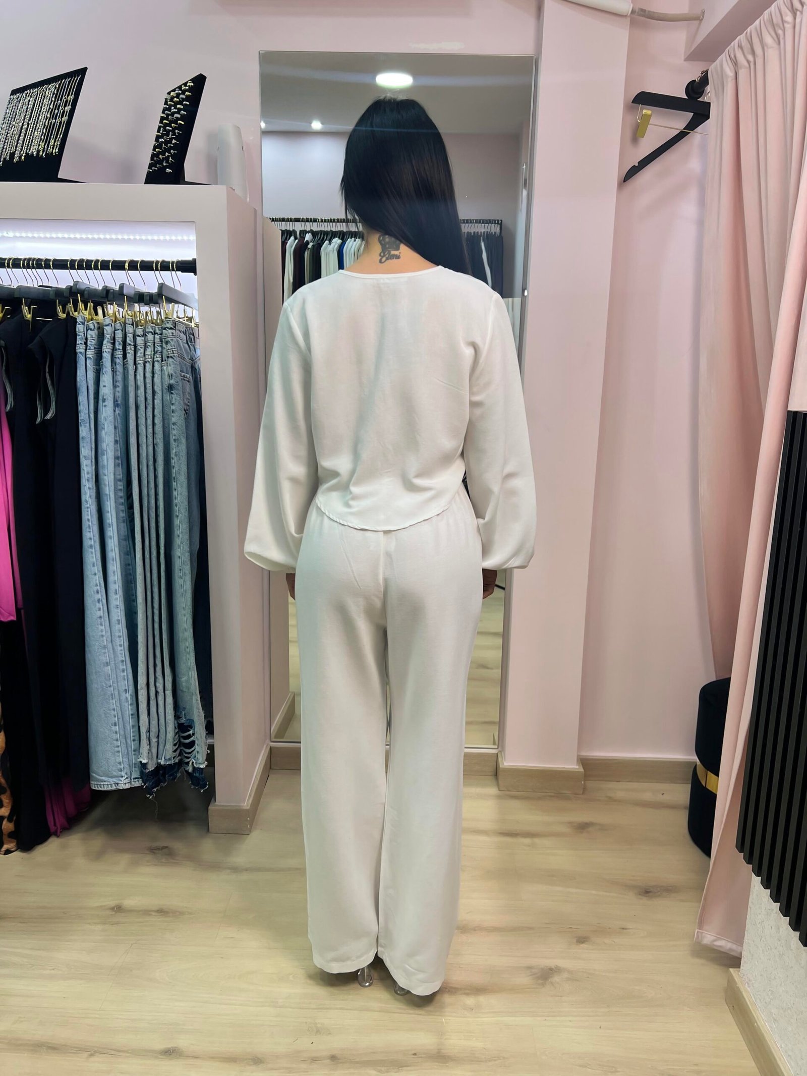 Ένα αέρινο και κομψό σετ που συνδυάζει άνεση με στυλ. Το τοπ διαθέτει ιδιαίτερο σχέδιο με τρία δεσίματα μπροστά και μακριά μανίκια με λάστιχο στις άκρες, προσφέροντας ανάλαφρη εφαρμογή και θηλυκότητα. Η ψηλόμεση παντελόνα με φαρδιά γραμμή χαρίζει ελευθερία κινήσεων και μπορεί να φορεθεί από το πρωί μέχρι το βράδυ.