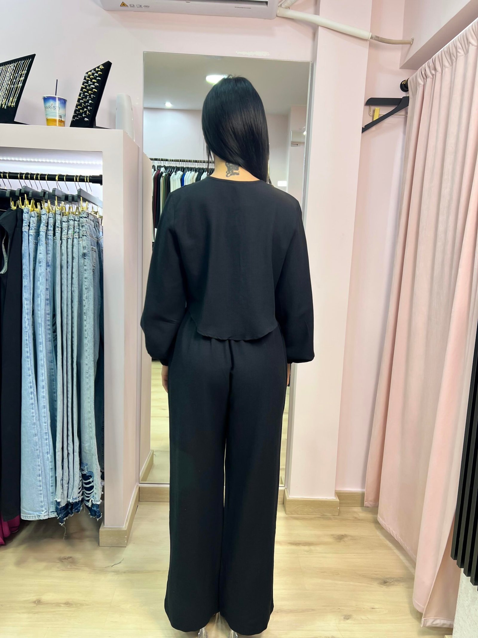 Ένα αέρινο και κομψό σετ που συνδυάζει άνεση με στυλ. Το τοπ διαθέτει ιδιαίτερο σχέδιο με τρία δεσίματα μπροστά και μακριά μανίκια με λάστιχο στις άκρες, προσφέροντας ανάλαφρη εφαρμογή και θηλυκότητα. Η ψηλόμεση παντελόνα με φαρδιά γραμμή χαρίζει ελευθερία κινήσεων και μπορεί να φορεθεί από το πρωί μέχρι το βράδυ.