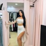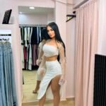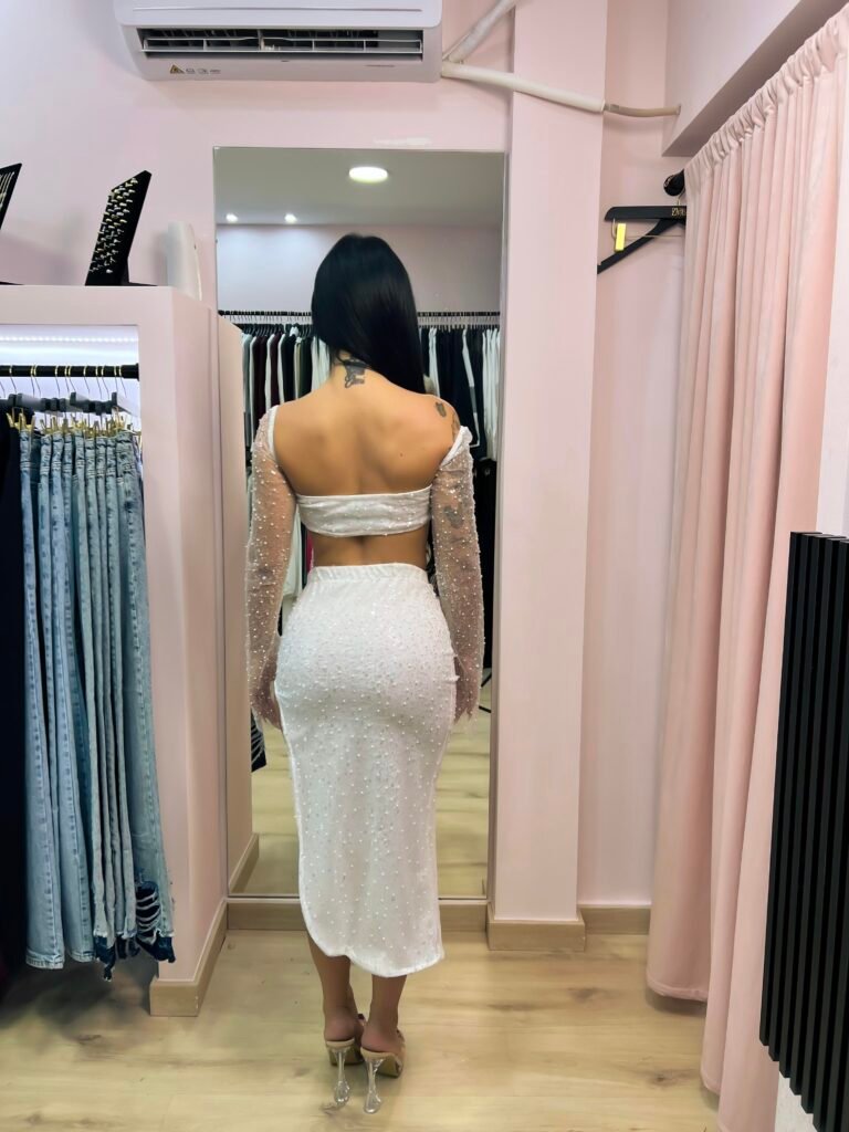 Εντυπωσιακό και εκλεπτυσμένο, αυτό το σετ συνδυάζει θηλυκότητα και δυναμισμό. Το crop τοπ με λεπτές τιράντες και διαφανή μακριά μανίκια με διακριτική λάμψη δίνει κομψότητα και glamour ύφος, ενώ η εφαρμοστή φούστα με βαθύ σκίσιμο στο πλάι χαρίζει σαγηνευτικό αποτέλεσμα και αναδεικνύει τη σιλουέτα.