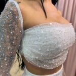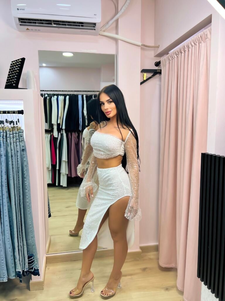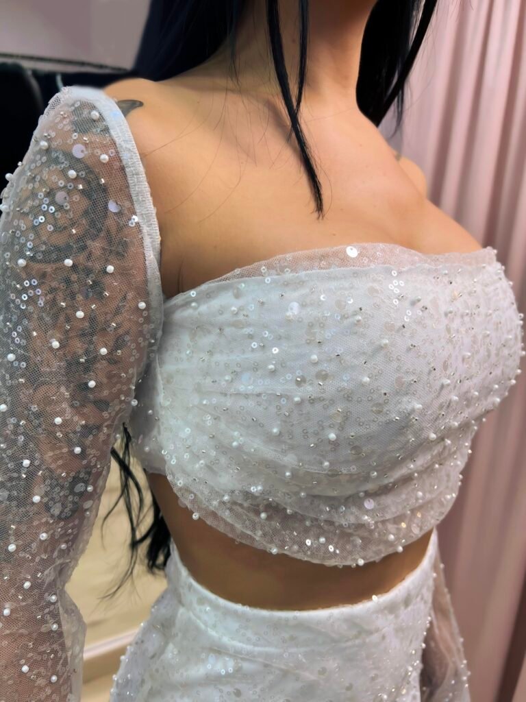 Λεπτομέρειες: Crop τοπ με τιράντες, διαφανή μανίκια με λάμψη, σκίσιμο στη φούστα