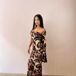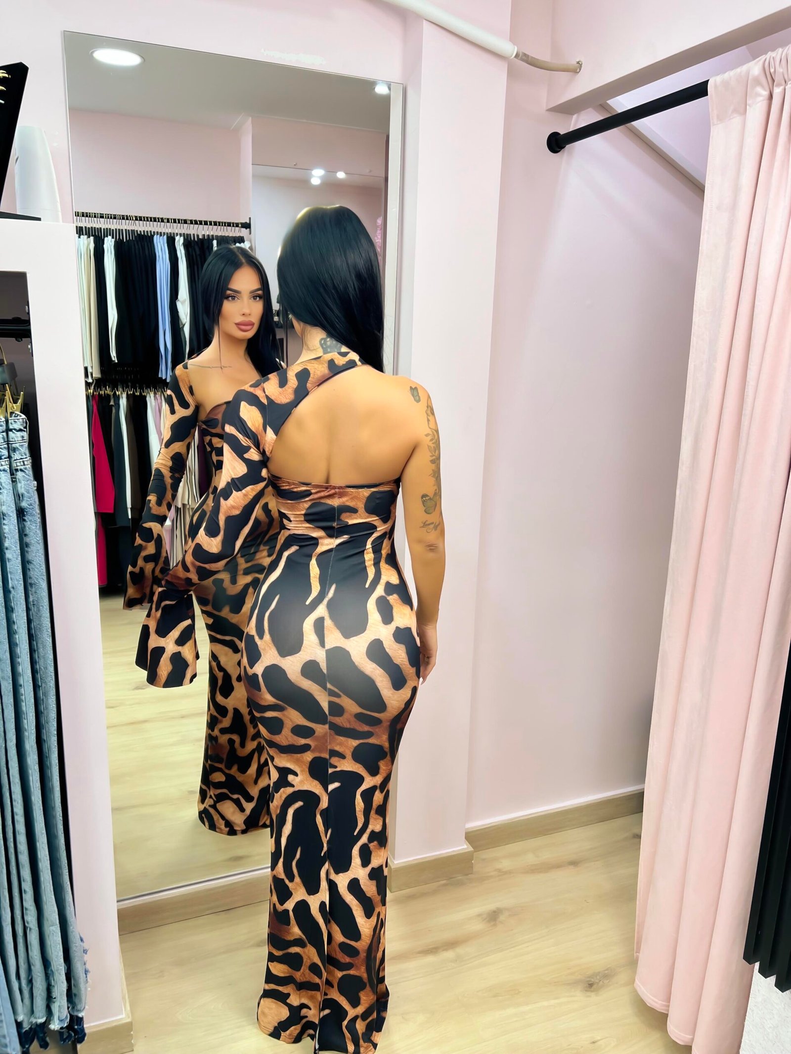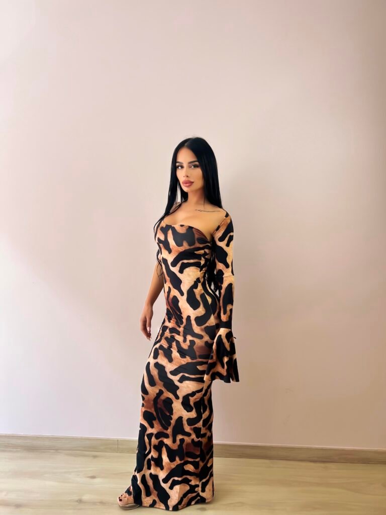 Το μακρύ μανίκι με όγκο και καμπάνα δίνει έναν ξεχωριστό χαρακτήρα στο φόρεμα, δημιουργώντας ένα statement look που συνδυάζει δυναμισμό και φινέτσα. Το ελαστικό ύφασμα εξασφαλίζει άνεση, ενώ το έντονο μοτίβο σε καφέ και μαύρες αποχρώσεις δίνει μια άγρια, σαγηνευτική αύρα.