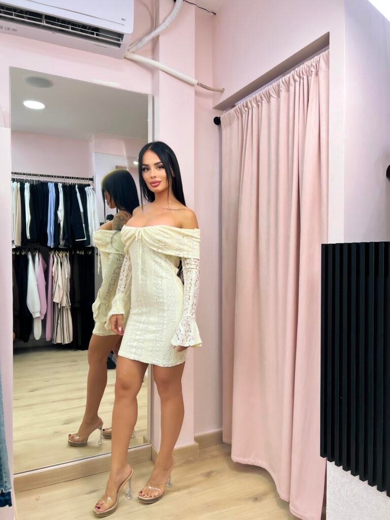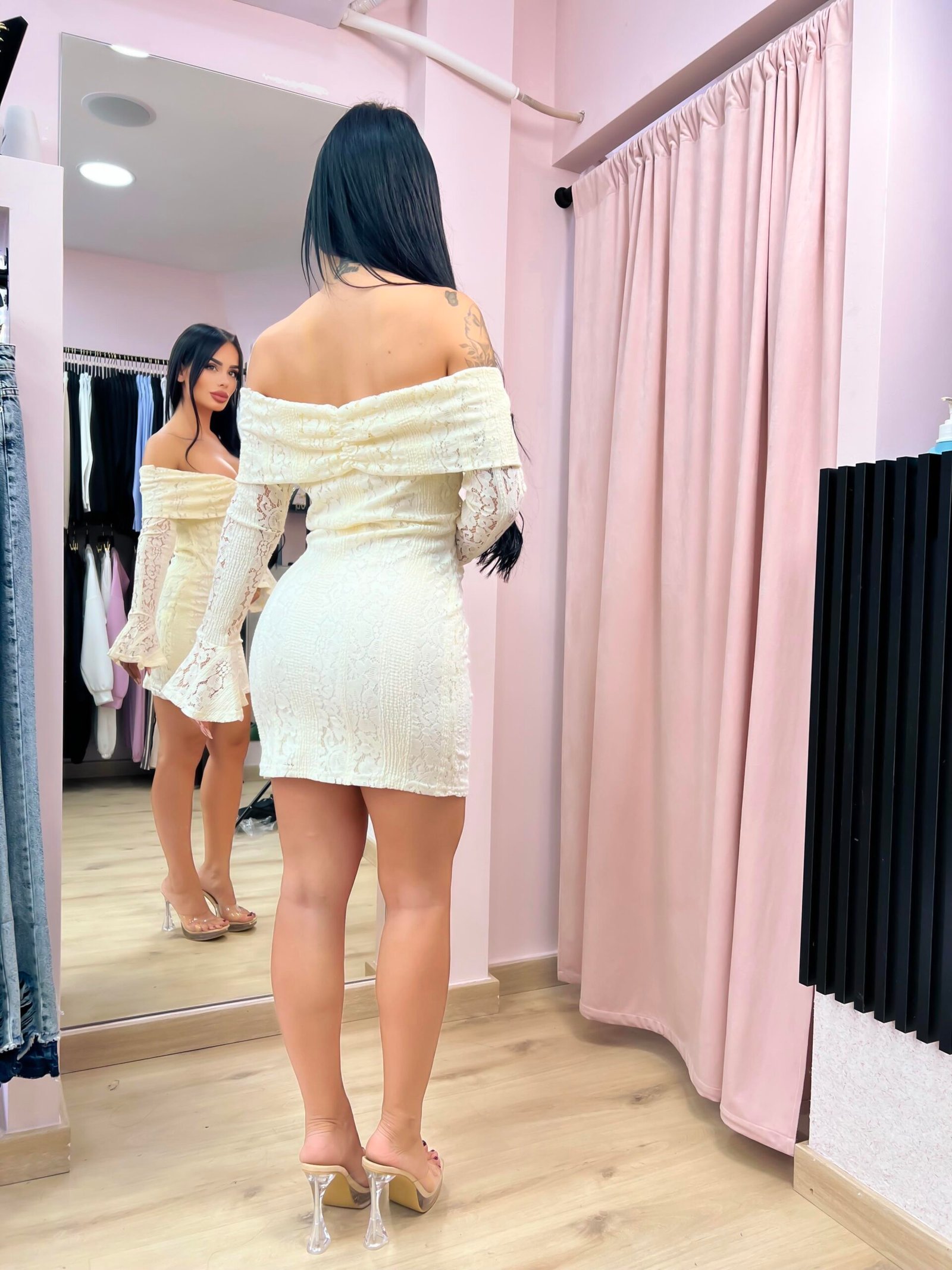 Ρομαντικό και θηλυκό, αυτό το mini φόρεμα ξεχωρίζει για το φίνο του σχέδιο και τις μοναδικές λεπτομέρειες. Η εφαρμοστή του γραμμή αναδεικνύει τη σιλουέτα, ενώ το off-shoulder κόψιμο δίνει κομψότητα και αισθησιασμό.