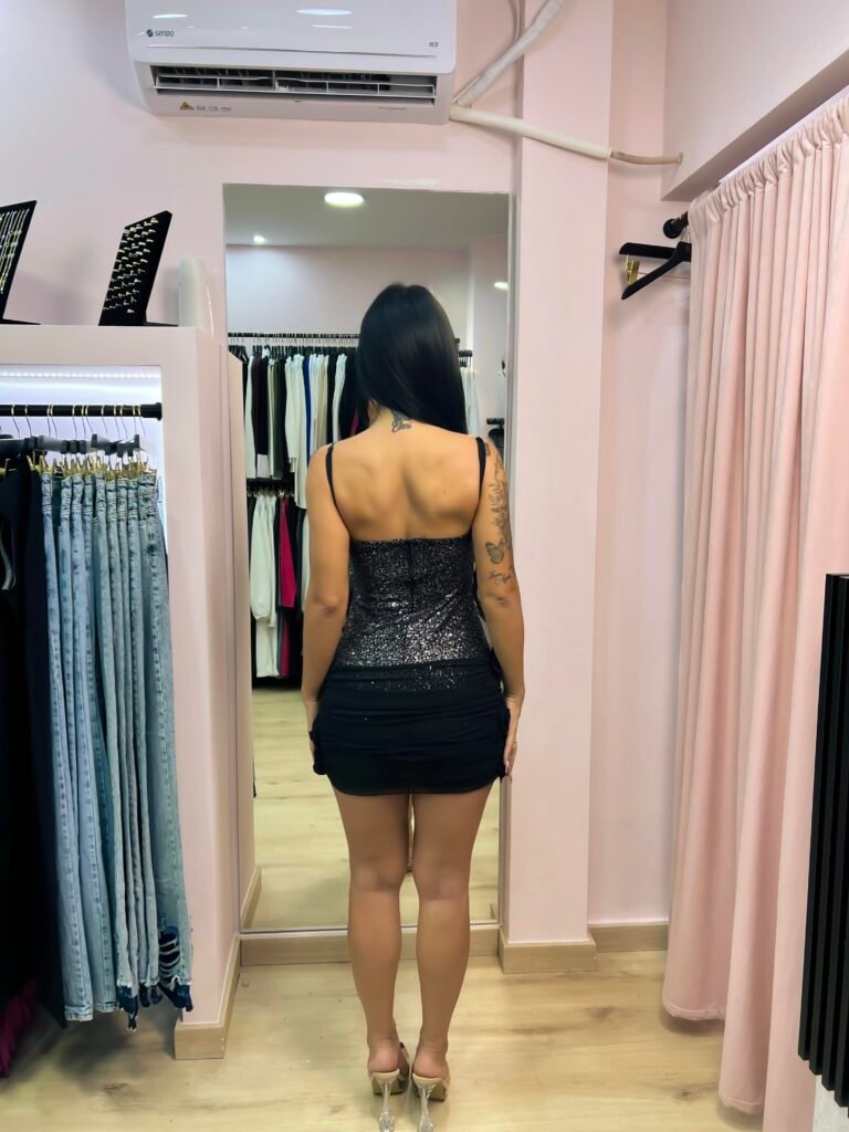 Εντυπωσιακό μίνι φόρεμα με στρας και λεπτές τιράντες διακοσμημένες με ροζέτες. Στενή εφαρμογή που αγκαλιάζει το σώμα και αναδεικνύει τη θηλυκότητα. Ιδανικό για βραδινές εξόδους και special εμφανίσεις.