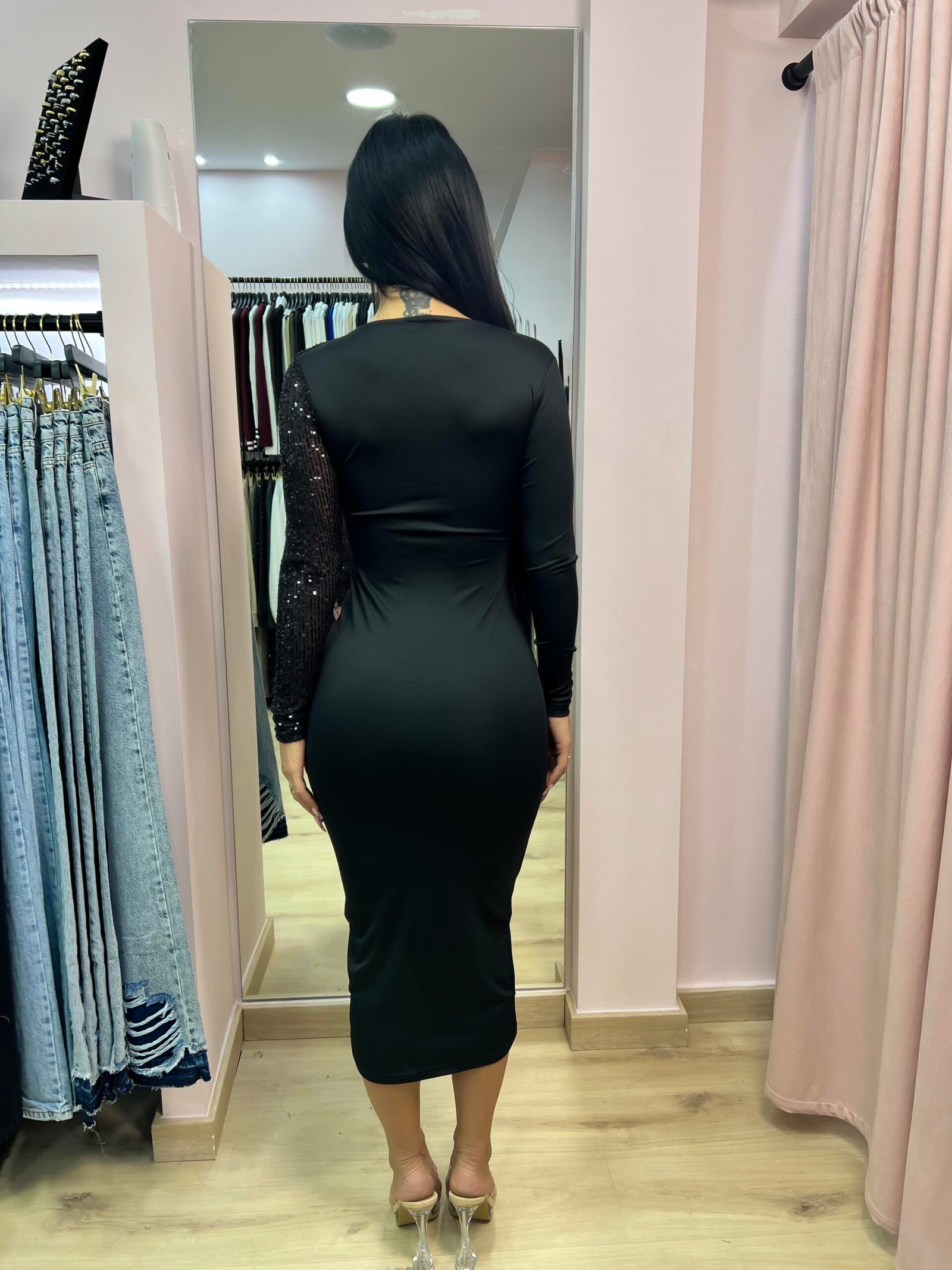 Ο μοντέρνος ασύμμετρος σχεδιασμός με ένα μακρύ μαύρο μανίκι και ένα λευκό μανίκι με παγιέτες δημιουργεί έντονη αντίθεση και glamour ύφος. Το ελαστικό ύφασμα προσφέρει άνεση και τέλεια εφαρμογή, καθιστώντας το ιδανικό για βραδινές εξόδους, κοκτέιλ πάρτι ή events που απαιτούν εντυπωσιακή εμφάνιση.