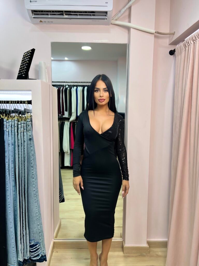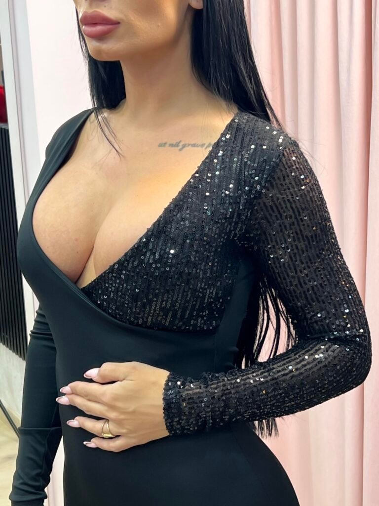 Εντυπωσιακό και κομψό. Η εφαρμοστή του γραμμή αγκαλιάζει το σώμα και αναδεικνύει τις καμπύλες, ενώ το βαθύ V ντεκολτέ προσδίδει αισθησιασμό και θηλυκότητα.