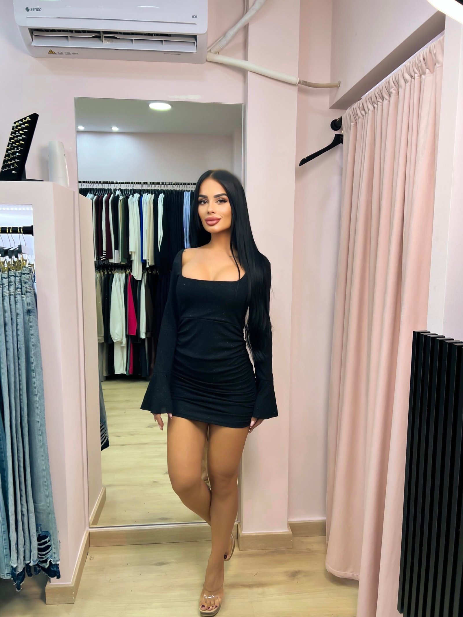 Εντυπωσιακό και θηλυκό, αυτό το mini φόρεμα ξεχωρίζει για τον αισθησιακό του σχεδιασμό και τις κομψές λεπτομέρειες. Η εφαρμοστή του γραμμή αναδεικνύει τη σιλουέτα, ενώ τα μακριά μανίκια σε καμπάνα προσδίδουν μια αέρινη και εκλεπτυσμένη πινελιά.
